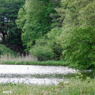 新緑の綺麗な輝く湖水・・・でなくて小さな池?のほとりに