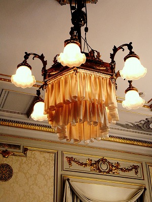 このシャンデリアに藤色の生地に黒い淵の木の椅子なの!