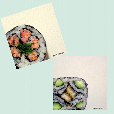 伊達巻で巻いたもの、具で文字や絵を表すもの。