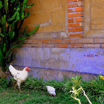 狭めな道を 自由にニワトリ親子が歩いてます。