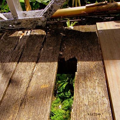アスファルトの隣にあった穴の開いた木の橋。