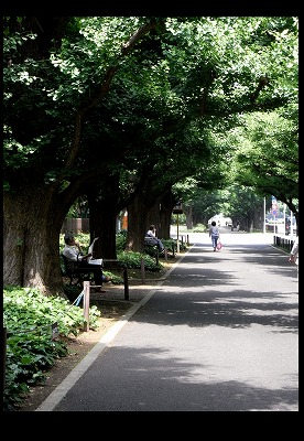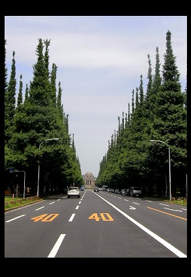 外苑のいちょうは、この方向から見ると高さが真っ直ぐになるように、