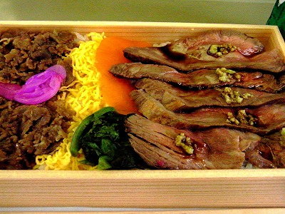 )右は相方の選んだ ヒモを引くと温かくなる 飛騨牛入り牛しぐれ弁当。