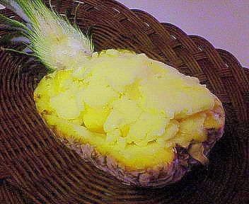 ① パイナップルを2つ割にして 中身をくりぬく。