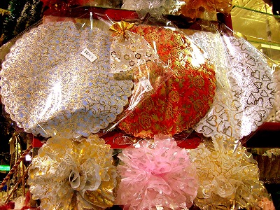 多分・・・なのですが、上の円形のセロファンを花の様に数枚重ねて花の様にし、左の写真 手前にうっすら見える籐でできた土台に差して ハート型などにして 結婚式に使うみたい!