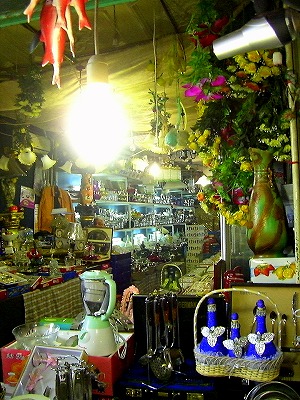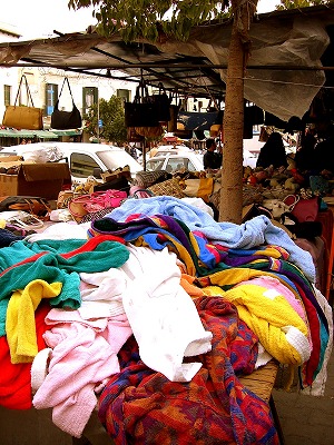 生活雑貨や古着が山と積まれて売られてます。