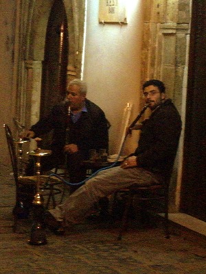 夕暮れ時になると カフェの前で水パイプを吸う姿も見えます。