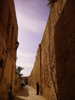 メディナ(旧市街)は南北700m、東西450mに広がる城塞都市で、こんな高~い城壁に取り囲まれています。その中に 市場があり~の、グランドモスクや 住宅があり~ので、切り立った壁に守られて街があります。