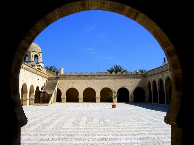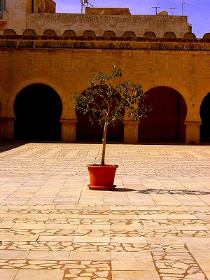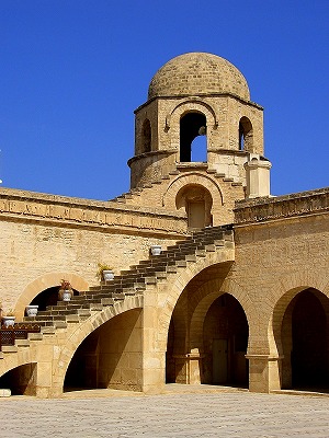スースの「グランドモスク」は、アラブ朝時代、851年にアブル・アバス帝によって建てられ、隣のリバトとともに当時は港や兵器を守る要塞の役割を果たしていたそうです。9世紀の完成時はミナレット(1日5回行われる礼拝の時間を教え、コーランを放送する高い塔の事)はなく、付けられたのは11世紀だったのだそうです。