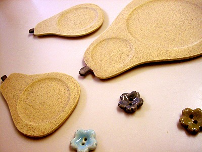 洋ナシ型がkokeiroさんで、陶器のボタンは翠風窯さんの作品です。とっても素敵でしょ?