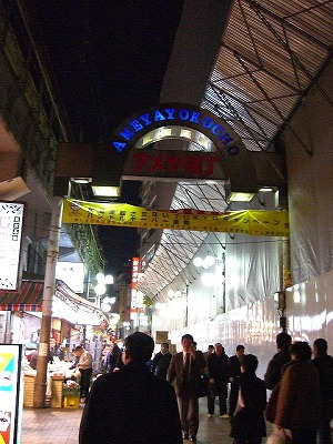 ご存知の通りここ「アメ横」は山積みになった お菓子や洋服や靴やお魚が