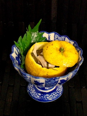 柚子をくりぬいて、小鯛の昆布〆に柚子汁を追加して