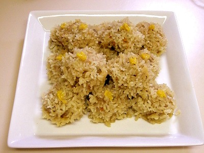 いつものしゅうまいの具に お湯に1時間つけたもち米(肉300に対して1カップぐらい)を