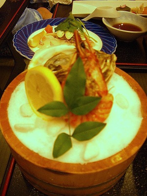 枡の中に焼け石が入ってる 海老味噌がきいたお味噌汁と