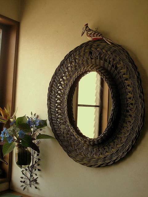 玄関入ると 去年彼女が作ったラタンの鏡に圧倒されます。
